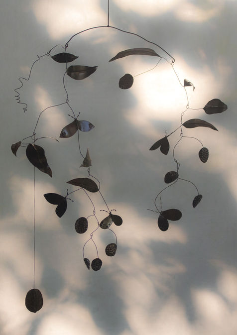 This work named as "Una", what began as a special creation for a friend. Something warm and heartfelt, expanded into a three-foot kinetic sculpture. This commissioned version integrates elements that speaks of growth – to fruit, to thrive and to flourish. A winged seed form hangs at the heart of the mobile, spinning constantly in the moving breeze, while the sculpture itself drifts in quiet, gentle rotation throughout the day.